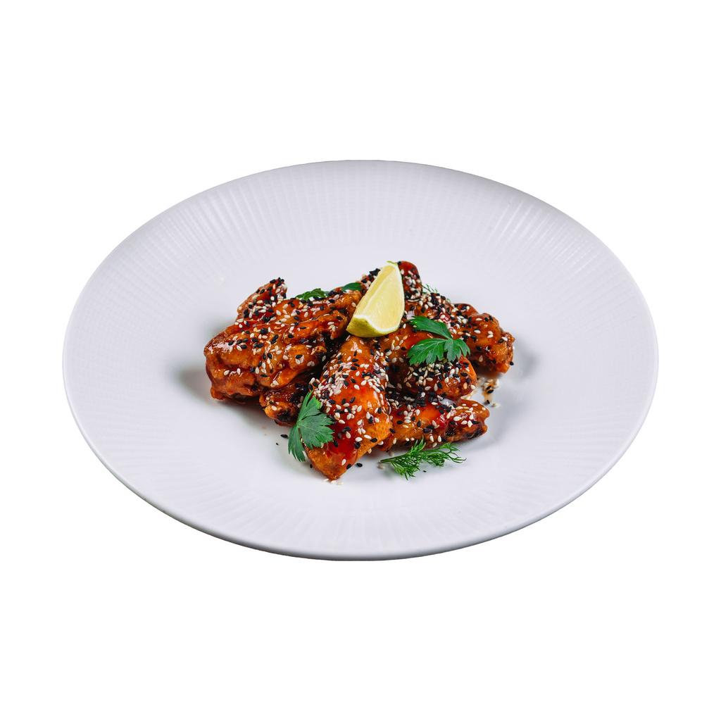 (250/10) Крылья куриные, соль, перец, масло чесночное и растительное, специя куриная, крахмал кукурузный, соус сладкий чили и лемонграсс,кунжут, лайм, зелень