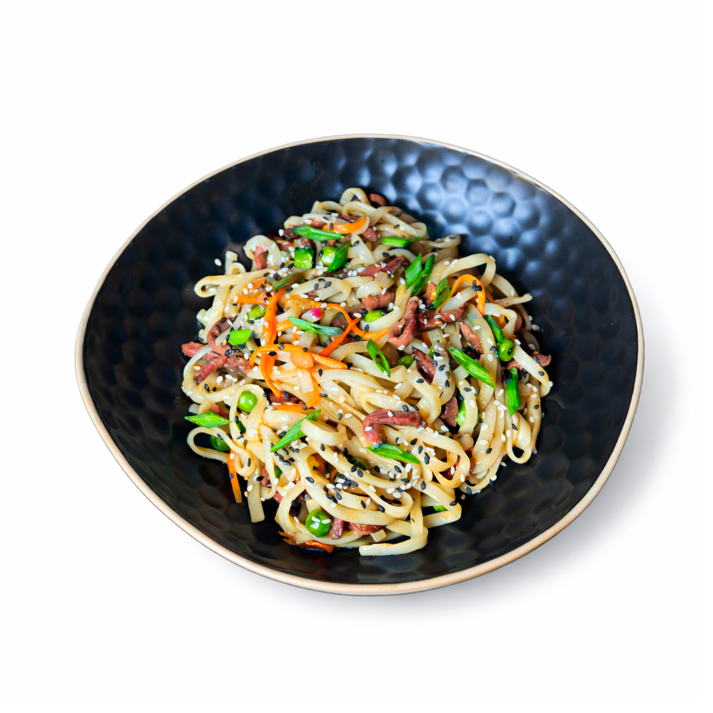 (320г) лапша удон,говядина сювид, лук репчатый, морковь, масло чесночное, бульон, соус соевый и терияки, горошек зеленый, имбирь, кунжут, лук зеленый