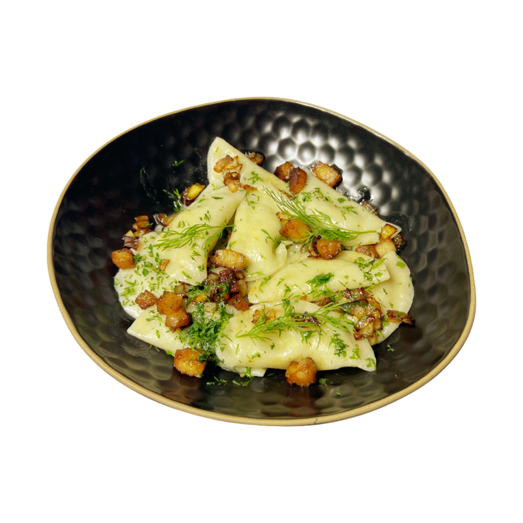 ВАРЕНИКИ С КАРТОФЕЛЕМ, ЗЕЛЕНЬЮ И ДОМАШНИМИ ШКВАРКАМИ